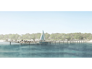 Die Seebrücke schwingt in weichen Bewegungen ins Meer, wie ein Wellenschlag in Richtung Horizont. Ihre fließende, formal reduzierte Gestalt baut sich harmonisch durch die Balance aus linearer Streckung und ondulierender Wellenbewegung auf. Die räumliche Bewegung des Brückenbauwerks erfolgt in mehreren Dimensionen: horiz. . .